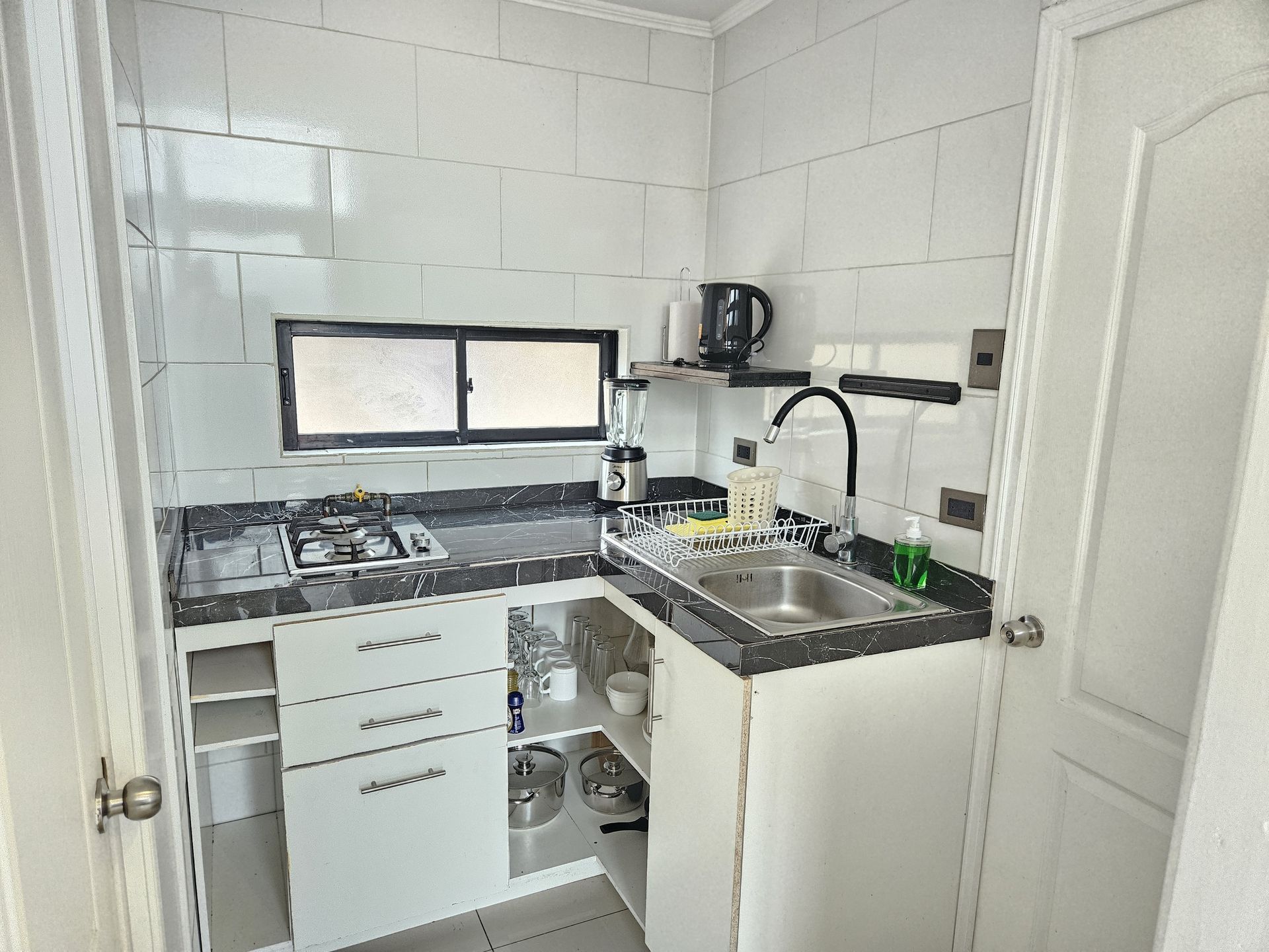 - Kit de cortesía: té, café, azúcar, sal, aceite, lavalozas y esponja